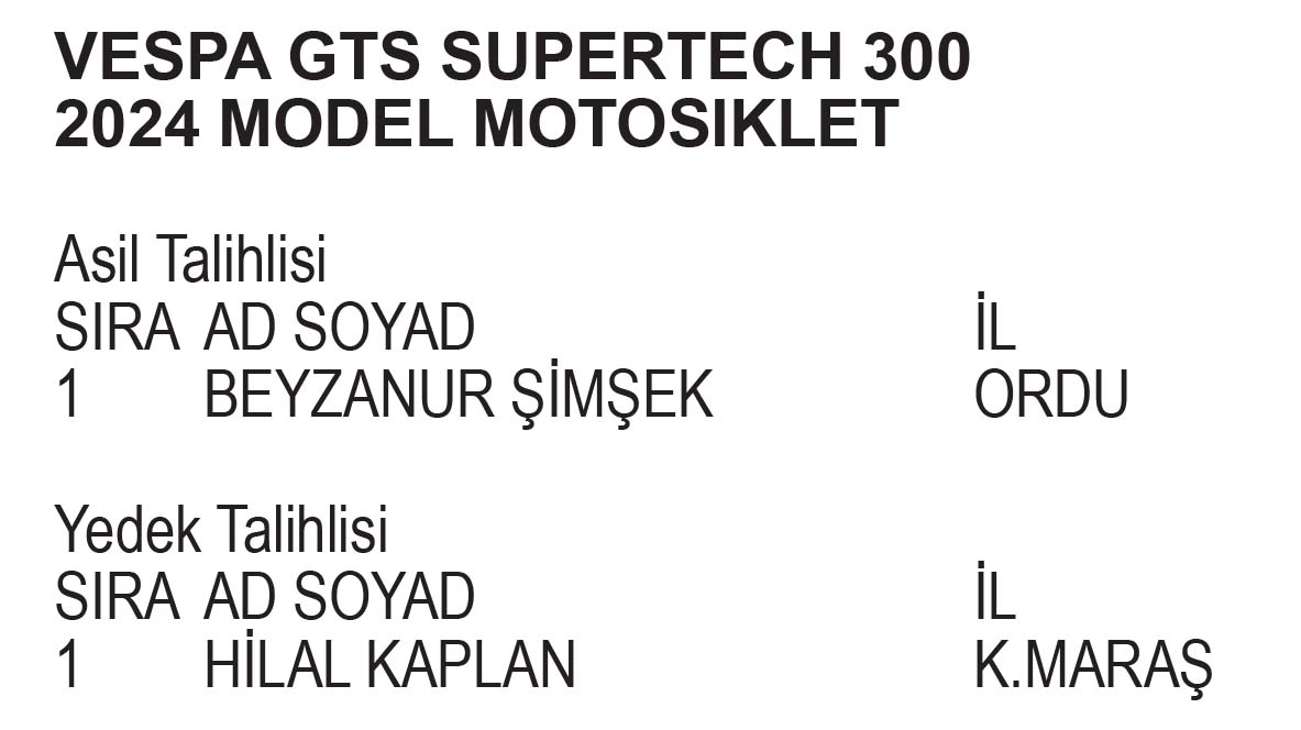 VESPA GTS SUPERTECH 300 2024 MODEL MOTOSİKLET KAZANAN ASİL VE YEDEK TALİHLİLER