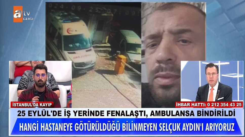 Müge Anlı ve Tatlı Sert'te ilginç bir olay yaşandı. 42 yaşındaki Selçuk Aydın, 25 Eylül Çarşamba günü çalıştığı iş yerinde rahatsızlandı. Ambulansla hastaneye götürülen Selçuk Aydın'ın hangi hastanede tedavi altına alındığı tespit edilemedi. Hangi hastaneye kaldırıldığı bilinmeyen Selçuk Aydın'a 9 gündür ulaşamayan annesi Müge Anlı'nın kapısını çaldı.
