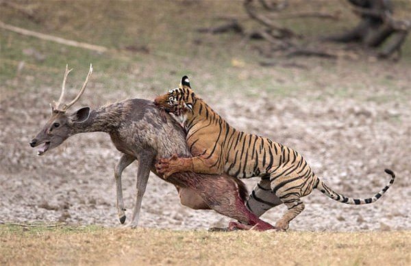 Sessiz ama hızlıca yaklaşan kaplan, avına bir anda saldırıyor ve işte ortaya bu görüntüler çıkıyor.