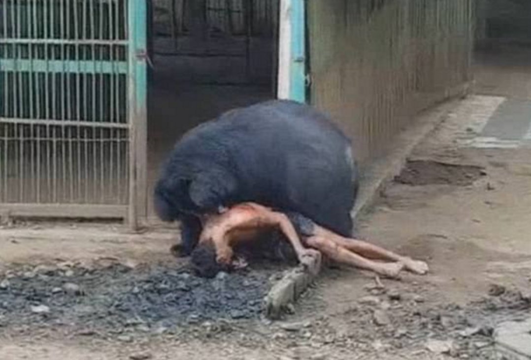 Yetkililerin aç bıraktığı anlaşılan iri hayvan, yara bere içindeki bitkin adamı dişleriyle tutup kafesine taşıdı.