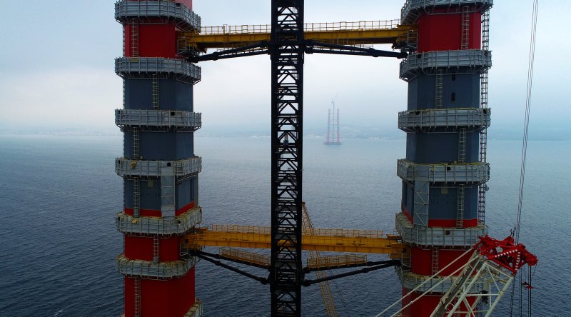 Köprünün Türk Bayrağının renklerini temsilen kırmızı beyaz ayaklarının inşasının yüzde 56,3'ü tamamlanmış son durumu havadan görüntülendi. Sütlüce ve Şekerkaya şantiyelerinde, köprü ayaklarına vinç yardımıyla getirilen kule blokları üst üste konulmaya devam ediyor.