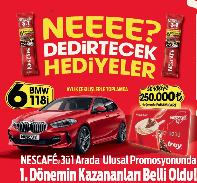 Nescafe 3ü1 Arada Ulusal Promosyonunda 1.dönemin kazananları belli oldu. İşte BMW 118i Sportline 2023 Model Otomobil ve 250.000 TL değerinde Nescafe Param Kart almaya hak kazanan asil-yedek talihliler...