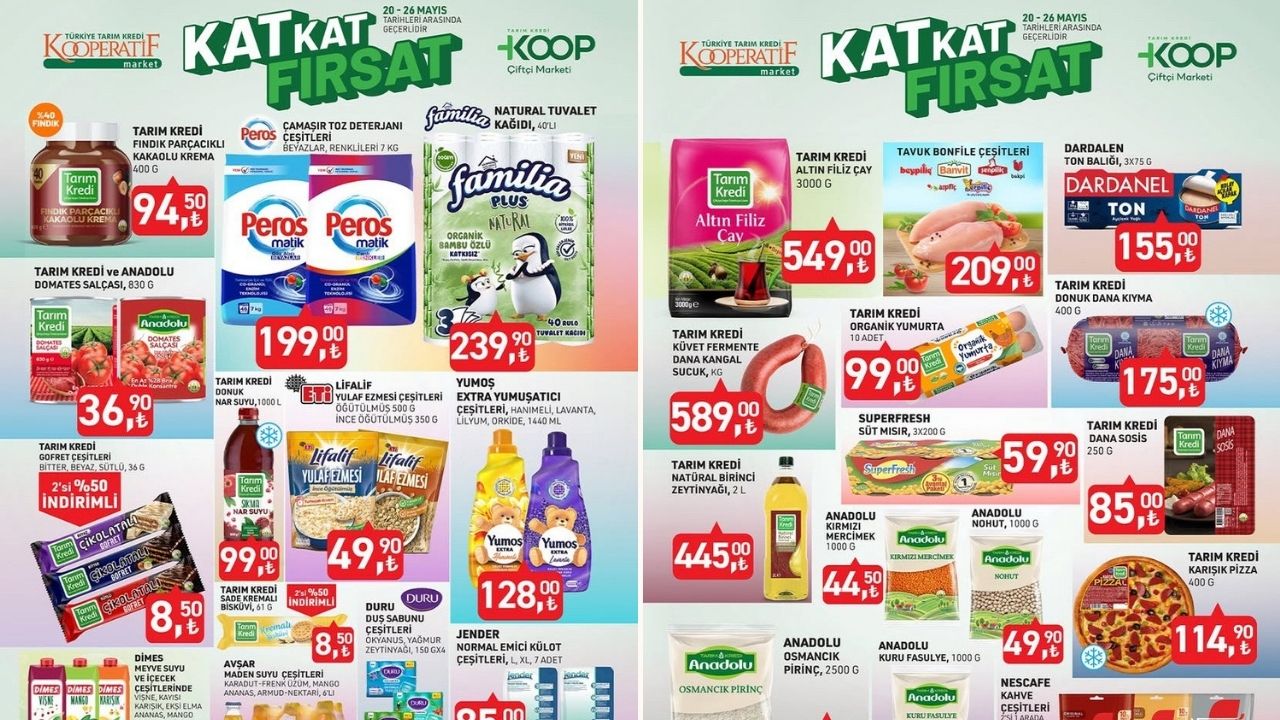 Tarım Kredi KOOP Çiftçi Marketi, Mayıs ayı kampanyalarına hız kesmeden devam ediyor. 20-26 Mayıs 2025 tarihleri arasında geçerli olan yeni indirim listesi yayımlandı. Temel gıdadan temizlik ürünlerine, kahvaltılıklardan kişisel bakım ürünlerine kadar onlarca kalem ürün bu hafta indirimli fiyatlarıyla raflarda tüketiciyi bekliyor.