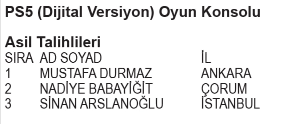 PS5 (Dijital Versiyon) Oyun Konsolu kazanan ASİL TALİHLİLER