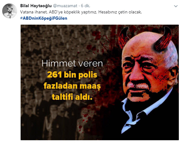 ABD'nin taşeronluğunu yaparak Türkiye'ye kalleşçe saldıran FETÖ'ye sosyal medya kullanıcıları sert tepki gösterdi. ABD'deki elemanlarıyla Türkiye'yi hedef alan FETÖ'ye #ABDninKöpeğiFGülen hashtagiyle binlerce Twitter kullanıcısı tepkilerini dile getirdi.