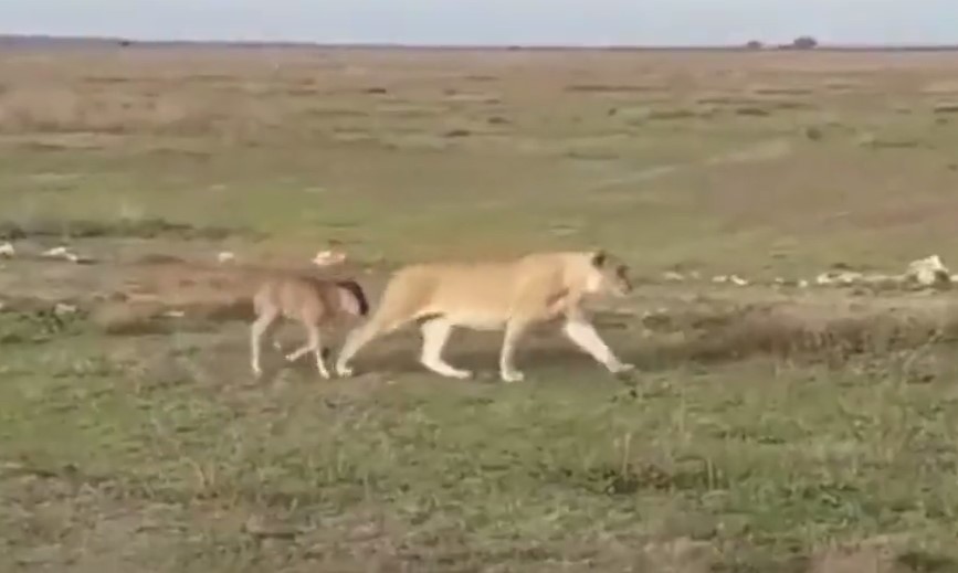Videoda dişi aslanın bebek antilopu koruyarak sürüsüne geri götürdüğü görülüyor.