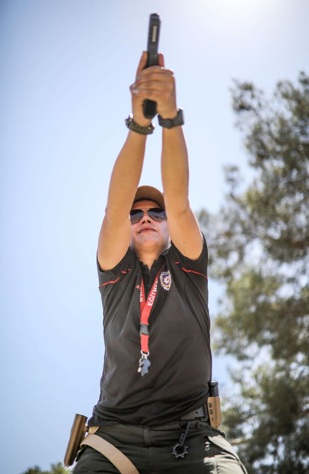 Bir dizi eğitimin ardından uzman atış eğitmeni olarak Antalya'ya tayin edilen Aydın, İl Emniyet Müdürlüğü Atış Poligonu'nda, meslektaşlarına tabanca ve uzun namlulu silahlarla hedefi tam 12'den vurmanın inceliklerini gösteriyor.