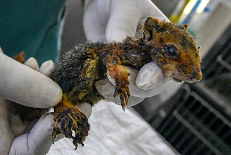 Alevlerden kurtulan yavru sincap da hayvanseverler tarafından tedavisi için Antalya'daki özel kliniğe getirildi. 1 aylık olduğu değerlendirilen yavru sincabın vücudundaki üçüncü derece yanıkların iyileştirilmesi için çaba harcanıyor. Burnu, ensesi ve ayakları yanan sincabın hayati tehlikesi devam ediyor.