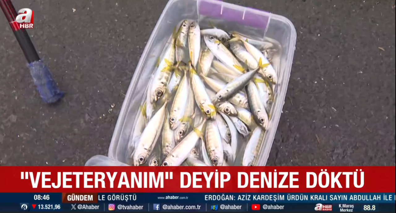 Bu sırada yanına yaklaşan kimliği belirsiz vejetaryen bir kadın, balıkları satın almak istediğini söyledi. "Parasını vereceğim" diyerek yaşlı adamı oyalayan kadın, bir anda balık dolu kovayı alıp denize boşalttı.