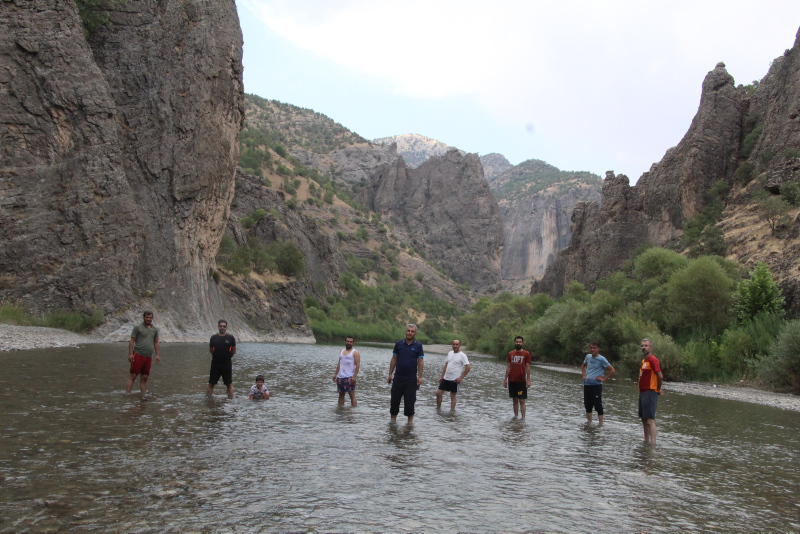 Dağlarla çevrili manzarasıyla ilgi çeken Hezil Çayı'na akın eden vatandaşlar, piknik yapıyor, suda yüzüyor, kumlarda güneşleniyor ve doğa yürüyüşü yapıyor.