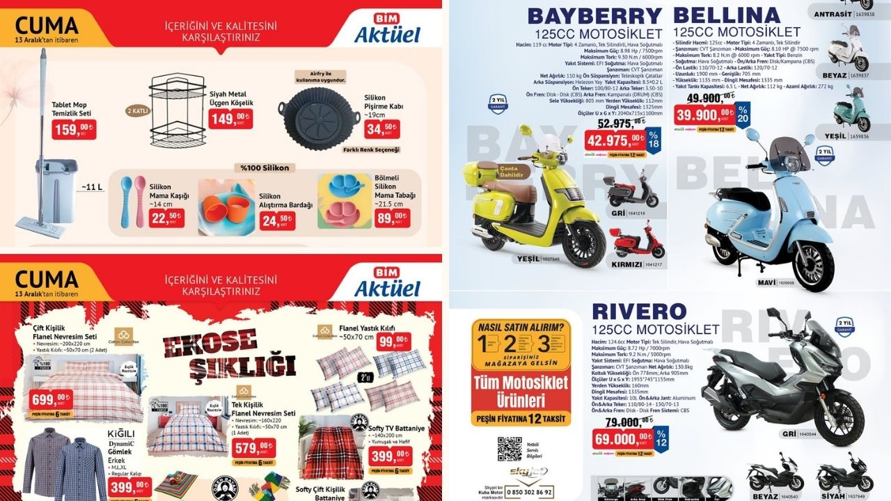BİM, 2024 yılına ait yeni aktüel kataloğu ile yine dikkatleri üzerine çekiyor. 125CC motosiklet tutkunları için BİM, Bayberry, Bellina ve Rivero markalarına ait motosikletleri cazip fiyatlarla sunuyor. Güncel BİM broşür içeriklerini takip ederek, birbirinden cazip indirimleri kaçırmamak mümkün. Peki bu hafta BİM kataloğunda hangi ürünler satışa sunulacak?