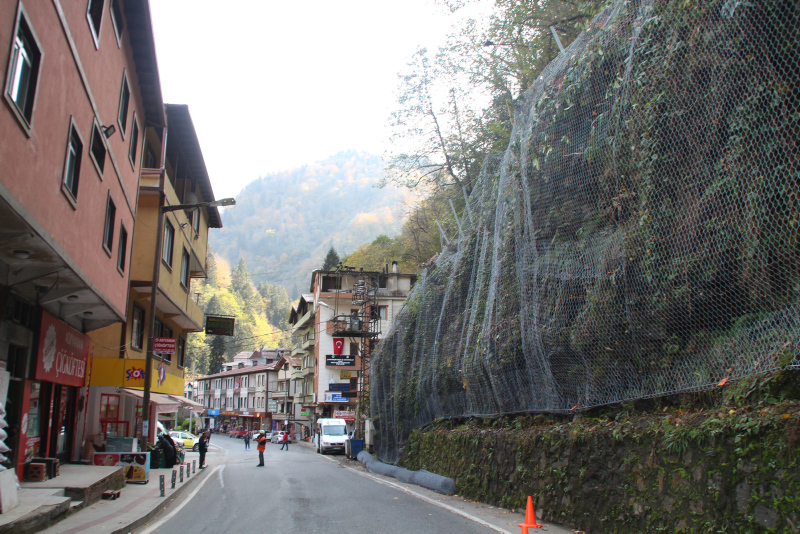 Ekipler, ardından yamaçları çelik ağlarla örerek güvenli hale getirdi. Yer yer 35 metre yüksekliği bulan tel örgülerle ilçe kaya tehdidinden kurtulacak.