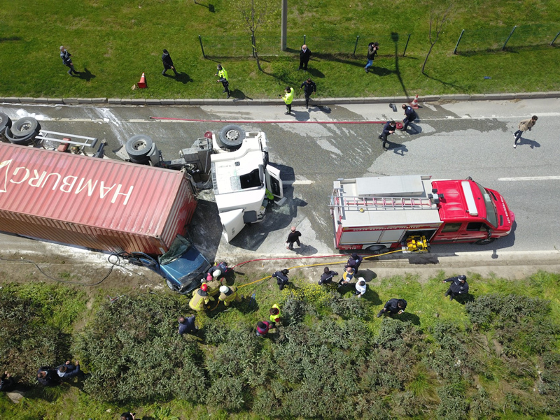 Kaza, saat 13.30 sıralarında, Orhangazi ilçesi Yeniköy kavşağında meydana geldi. Yakup Işık'ın (38) kullandığı 16 AHV 969 plakalı, sunta yüklü TIR, Selahattin Sevimli yönetimindeki 10 SB 690 plakalı otomobilin üzerine devrildi.