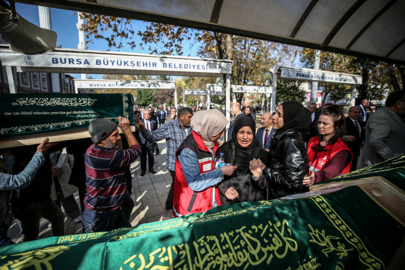 Amina Eltaha Elmuse ile yaşları 1 ile 11 arasında olan 8 çocuğun cenazeleri, Bursa Adli Tıp Kurumu morgundaki işlemlerin ardından Mihraplı Camisi'ne getirildi.