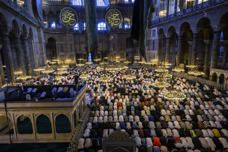 İstanbul'un farklı yerlerinden bayram namazı için Ayasofya-i Kebir Cami-i Şerifi'ni tercih edenler, içeride boş yer kalmayınca avluda namaz kıldı.