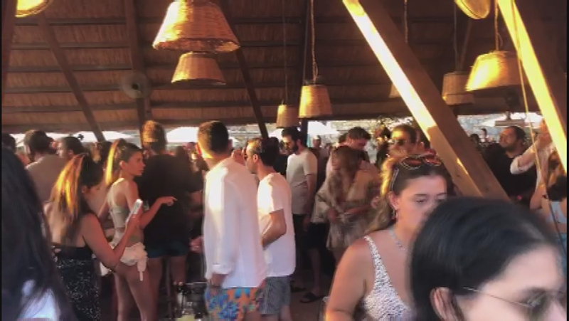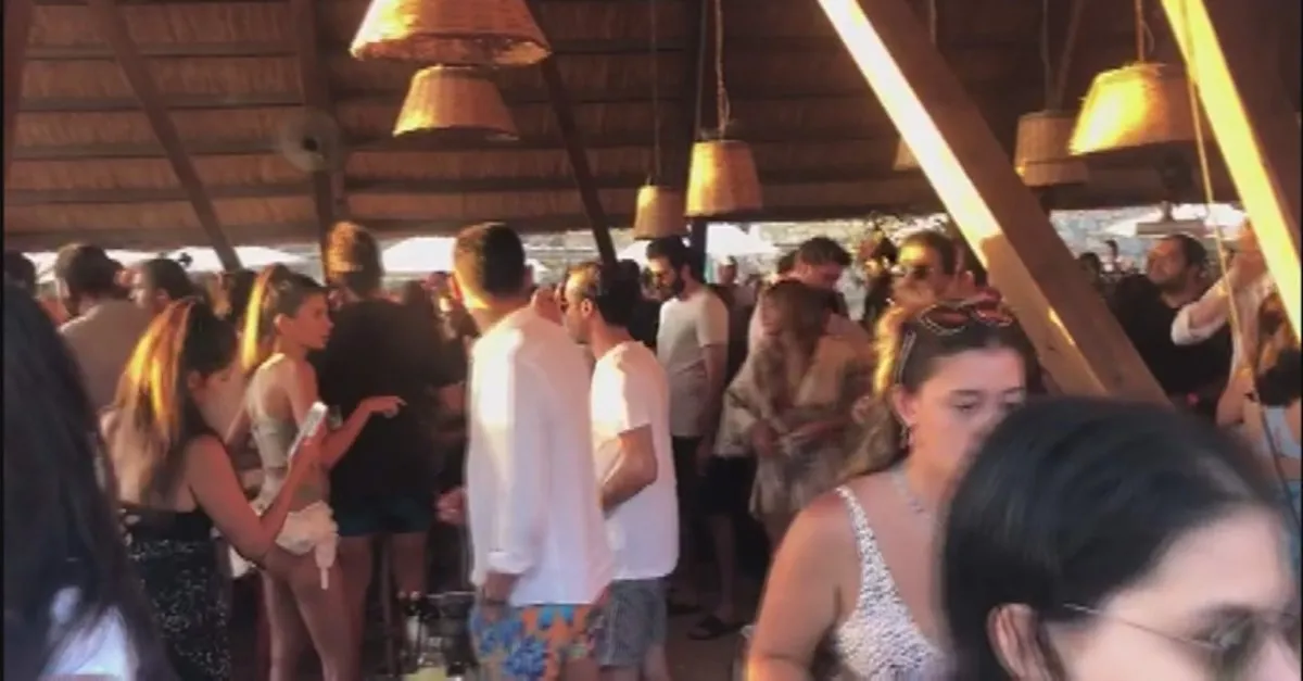Çeşme'de sahillerde düzenlenen eğlencelerde sosyal mesafe ve maske kuralına uyulmadı.