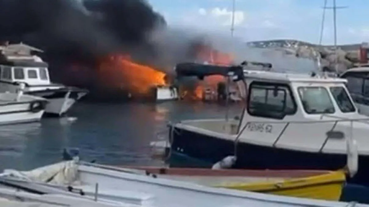 İzmir'in Çeşme ilçesinde bir teknede çıkan yangın kısa sürede büyüdü. Alevlerin yayılmasıyla 7 tekne yandı.
