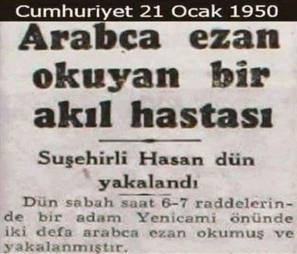 CHP'li günlerdi. Arapça ezanın yasaklandığı günler. Ezanın Türkçeleştirildiği günler… Ezanı Arapça okuyanın suçlu ve "akıl hastası" diye gazete manşetlerine taşındığı günler… İşte 21 Ocak 1950 tarihli Cumhuriyet gazetesi…"Arapca ezan okuyan bir akıl hastası" diye başlık atılmış. Medyada Arapça ezan okuyana "akıl hastası" muamelesi yapıldığı günler…