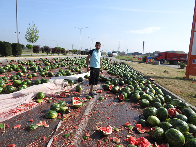Sürücünün yara almadığı kazada, karpuzların dökülmesi sonucu karayolu ulaşımı kapandı.
