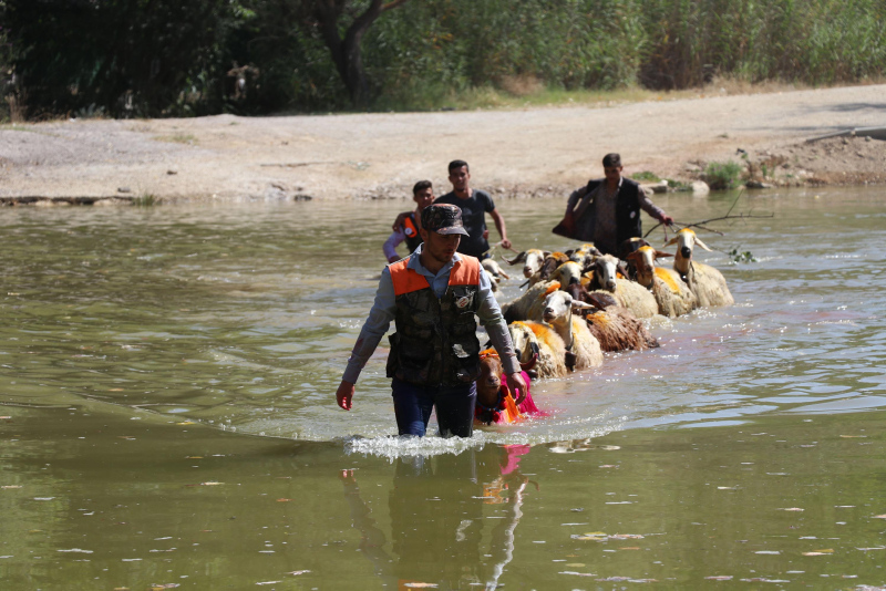 Toprak yoldan koyunlarıyla birlikte gelen çobanlar önce kendisi suya atlayarak çıkardığı sesle koç ve koyunlarının suya atlaması bekledi.