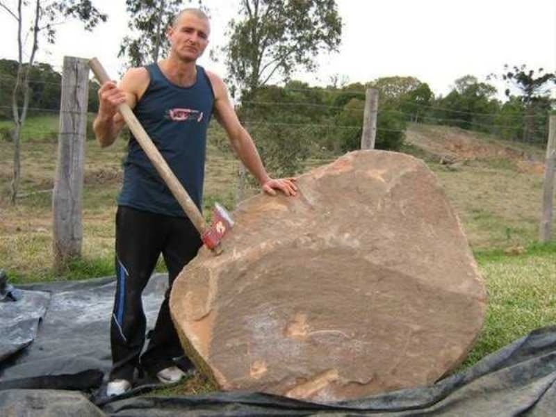 Elinde baltayla duran bu adam bir sanatçı bakın dev kayayı bakın ne hale getirdi.