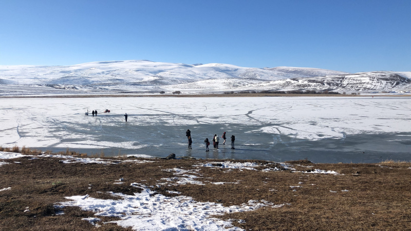Tur Rehberi Çiğdem Düger, "Kars- Ardahan arasındaki Çıldır Gölü'nün 20 santimetre kalınlığında buz tutması nedeniyle buraya geldik. Misafirlerimiz gölün üzerine çıktılar.