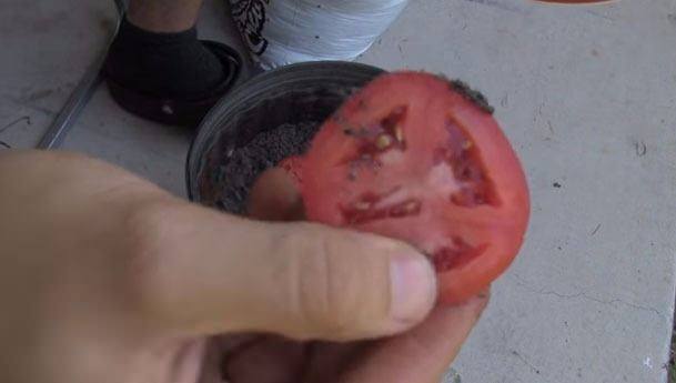 Videoyu çeken kişi, sadece bir saksı, biraz toprak ve bozulmak üzere olan bir domatesle nasıl yeni domatesler elde edebileceğimizi gösteriyor.