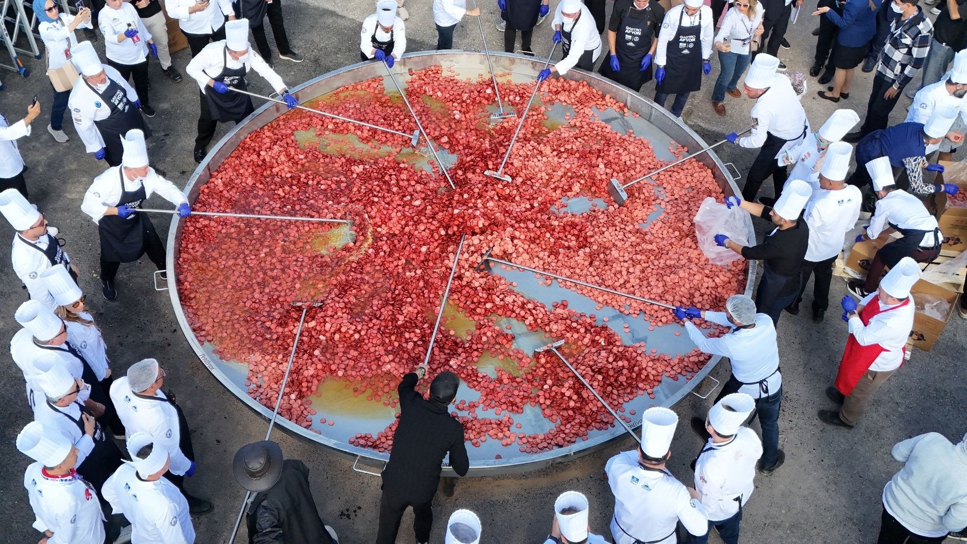 Profesyonel Aşçılar Federasyonu'na bağlı 30 şefin emeğiyle hazırlanan sucuklu yumurta, Guinness World Records Denetmeni Şeyda Subaşı Gemici'nin gözetiminde pişirildi.