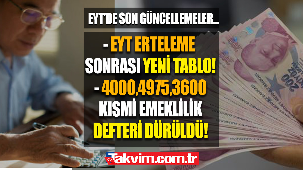 EYT son dakika gelişmeleri milyonlarca kişi tarafından merak ediliyor. Yaşanan Kahramanmaraş depremi sonrası ertelenen EYT için çalışmaların nasıl ilerleyeceği araştırıldı. EYT 3600, 5000 gün, kısmi emeklilik ve EYT maaşları hakkında detaylar netleşti. EYT 5000 gün mü, şartları ne soruları, 4 maddelik EYT yasa teklifinin Meclis Başkanlığı'na sunulmasıyla birlikte vatandaşların gündeminde yer alıyor. 2'si yürürlük maddesi olmak üzere 4 maddelik EYT yasa teklifinin detayları belli oldu. Son olarak düzenleme TBMM Plan ve Bütçe Komisyonu'ndan geçerek Meclis Genel Kurulu onayına kalmıştı. Onay işleminin tamamlanmasıyla Resmi Gazete'de yayınlanacak ve başvurular alınacak. EYT çalışmaları için gözler kritik tarihe çevrildi. EYT kısmi emeklilik şartları için son düzlüğe girildi. Peki, EYT ne zaman yasalaşacak? EYT kısmi emeklilik şartları neler? İşte 18 Şubat 2023 EYT son dakika gelişmeleri...
