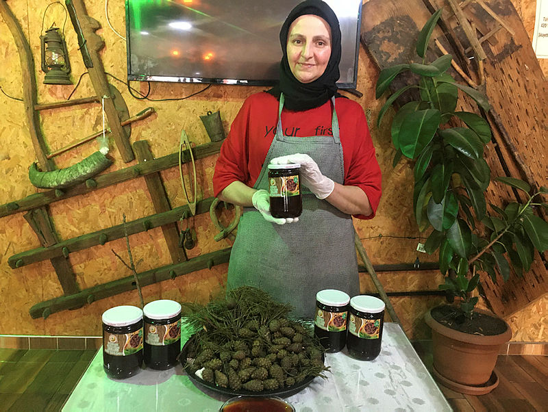 Gülten Özsoy, ormandan topladığı çam kozalaklarını evinin bahçesinde kazanda kaynatarak pekmez haline getirdi. Eşinin rahatsızlığına iyi geldiğini anlayan Gülten Özsoy, 5 yıl önce 30 kilo üreterek başladığı pekmez yapımına şu anda 5 tona ulaşarak siparişlere yetişmeye çalışıyor.