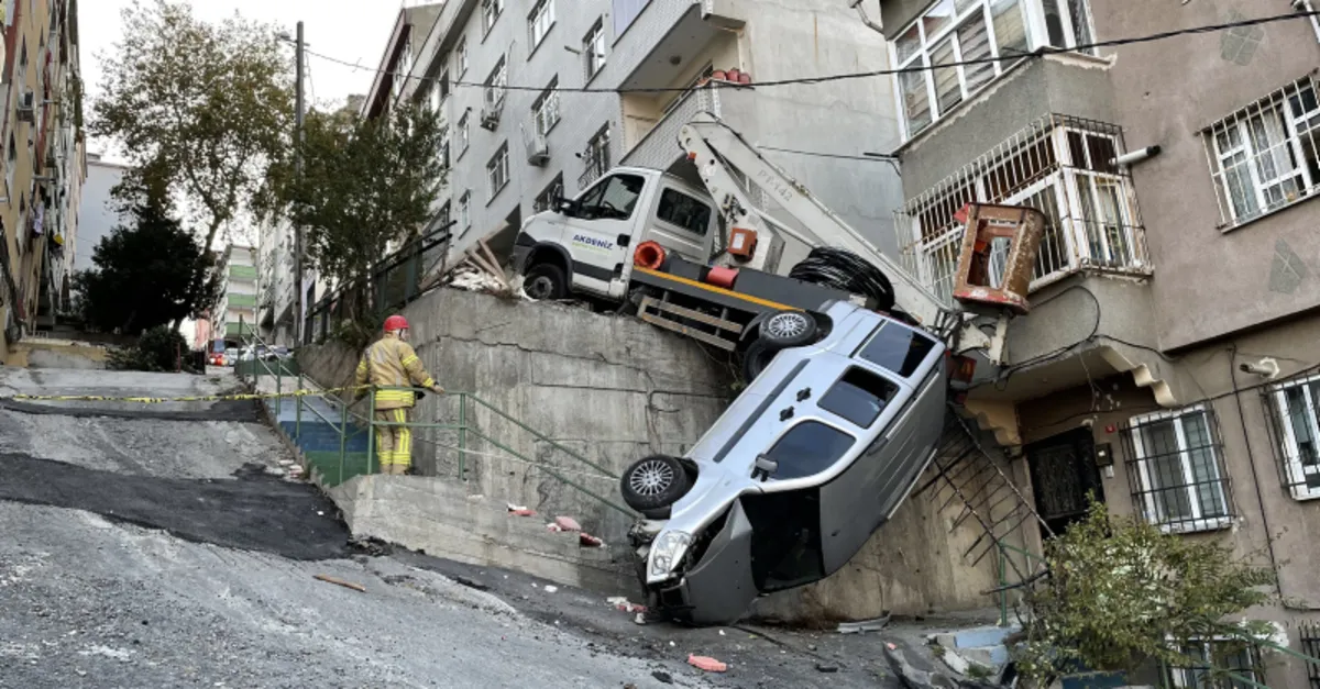 Kayarken çarptığı park halindeki hafif ticari araç istinat duvarından aşağı düştü. Bakım onarım aracı duvarda asılı kaldı. Hafif ticari aracın düştüğü yerde bulunan Elif Göğüs, yanındaki çocuğunu da çekerek son anda kaçabildi.