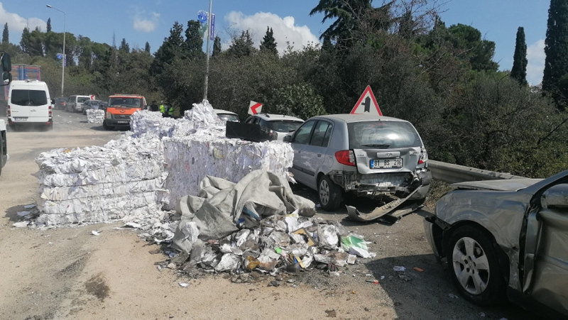 Devrilen kamyon yoldan çekilirken, yola saçılan kağıtların temizlenmesinin ardından yol ulaşıma açıldı.
