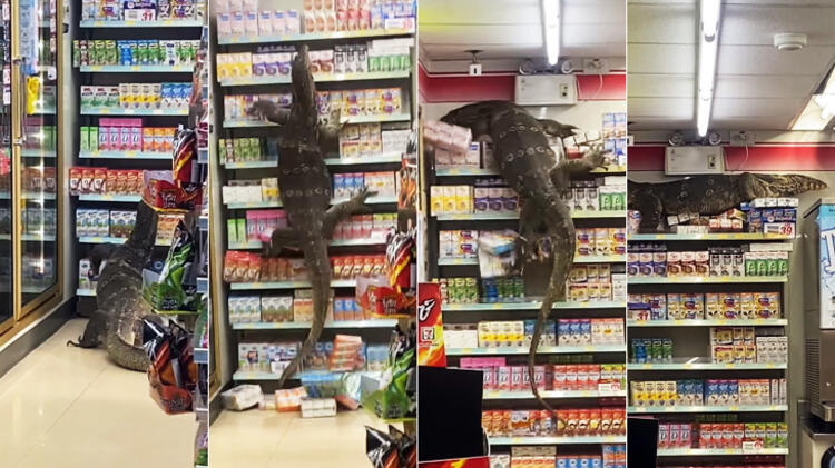 Narimpa Tangsin'in Facebook hesabında yayınladığı görüntülerde, dev kertenkelenin içecek dolabını bırakıp süt reyonuna tırmanmaya başladığı görülüyor.