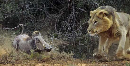 Kameralara işte böyle yansıyor. Bir ara aslandan kaçmaya çalışan Afrika domuzu, bu hamlesinde başarılı olamıyor.