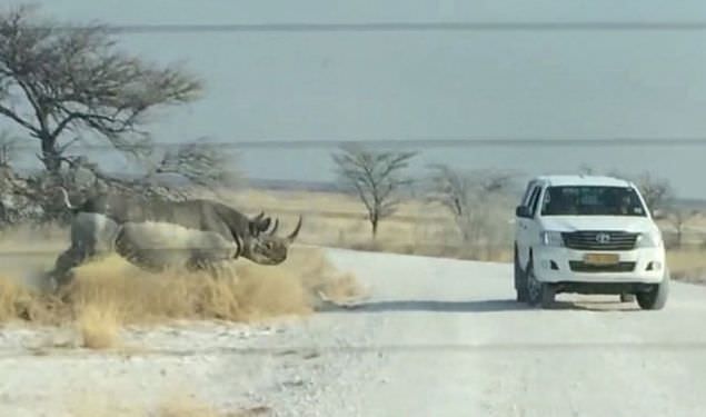 Nambiya'daki ulusal parktaki bir gergedan önce turistlerin bulunduğu aracı izledi. Gergedanın merakı hızlıca öfkeye döndü ve şiddetli bir şekilde cipe çarptı.