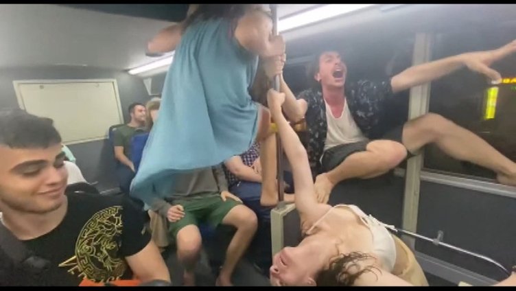 Koltukların üzerine çıkan, direkleri kullanarak da dans eden gruptakiler kameralara yansıdı.