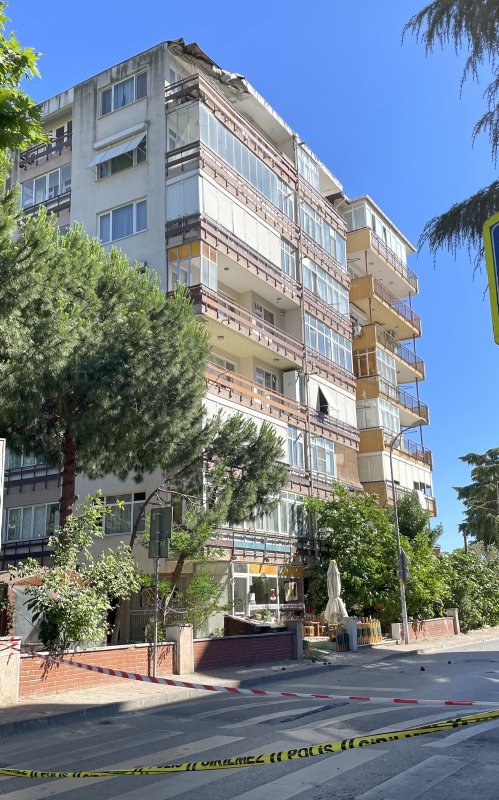 Gürültüyü duyarak dışarı çıkan apartman sakinleri çatıdan yere düşen parçaları fark ederek durumu polise bildirdi.