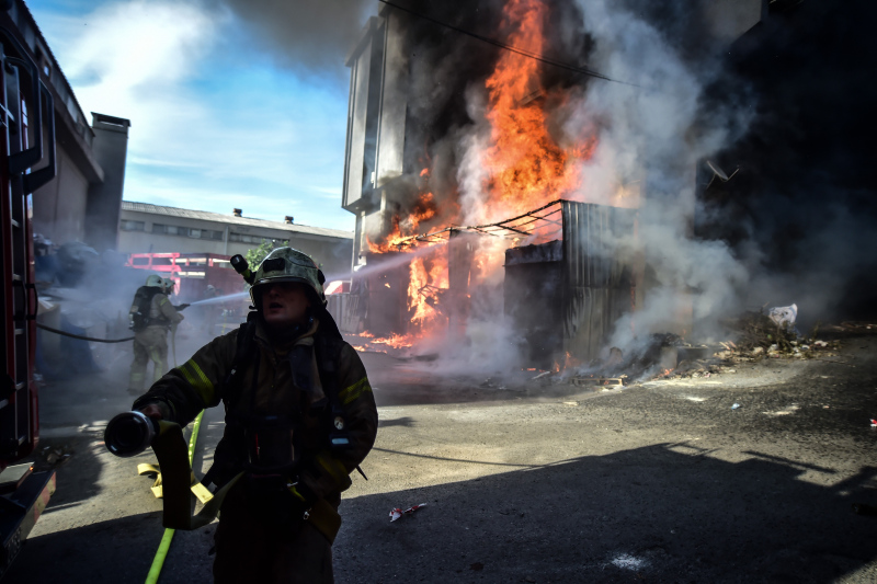 İçeride bulunan çalışanlar panik halde dışarı çıkarken, alev alev yanan bina havadan drone ile görüntülendi.