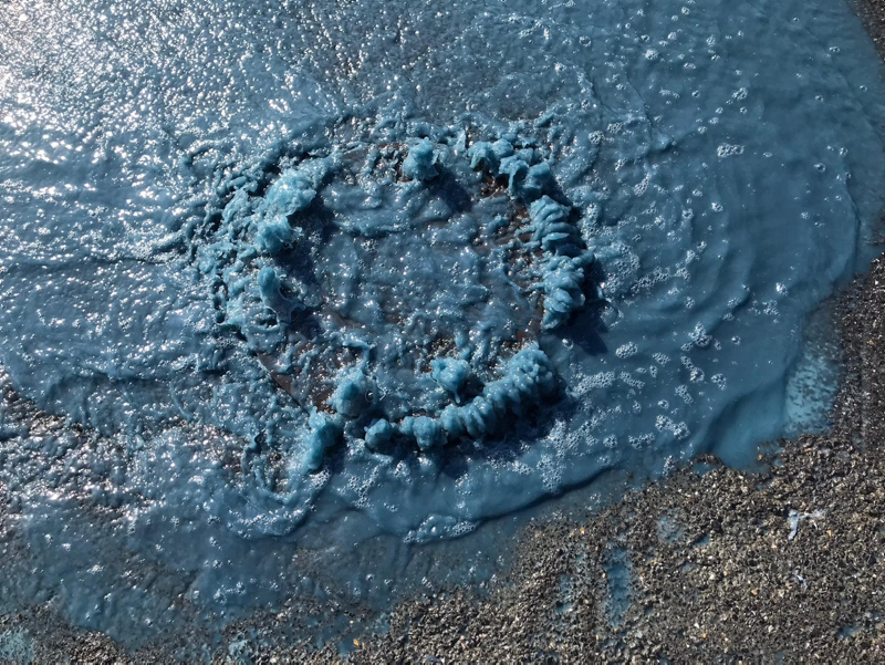 İki gündür rögardan mavi su çıktığı öğrenilirken, caddenin büyük bölümü maviye boyandı. Rögardan taşan mavi su havadan görüntülendi.