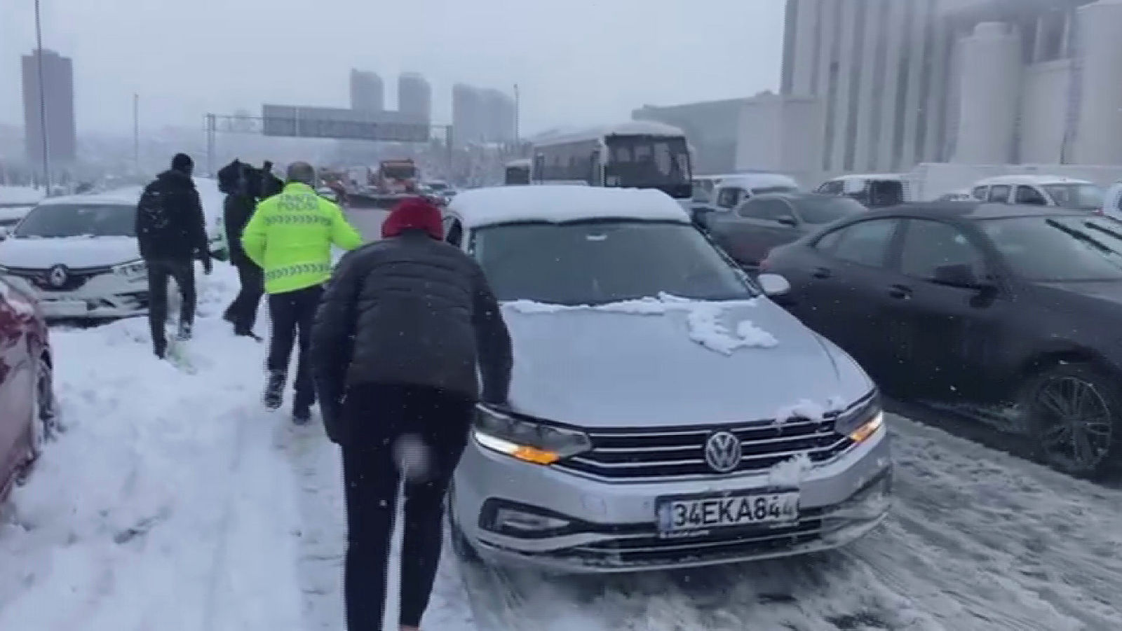 Yolda kalan araçları polisler iterek kurtarmaya çalıştı.