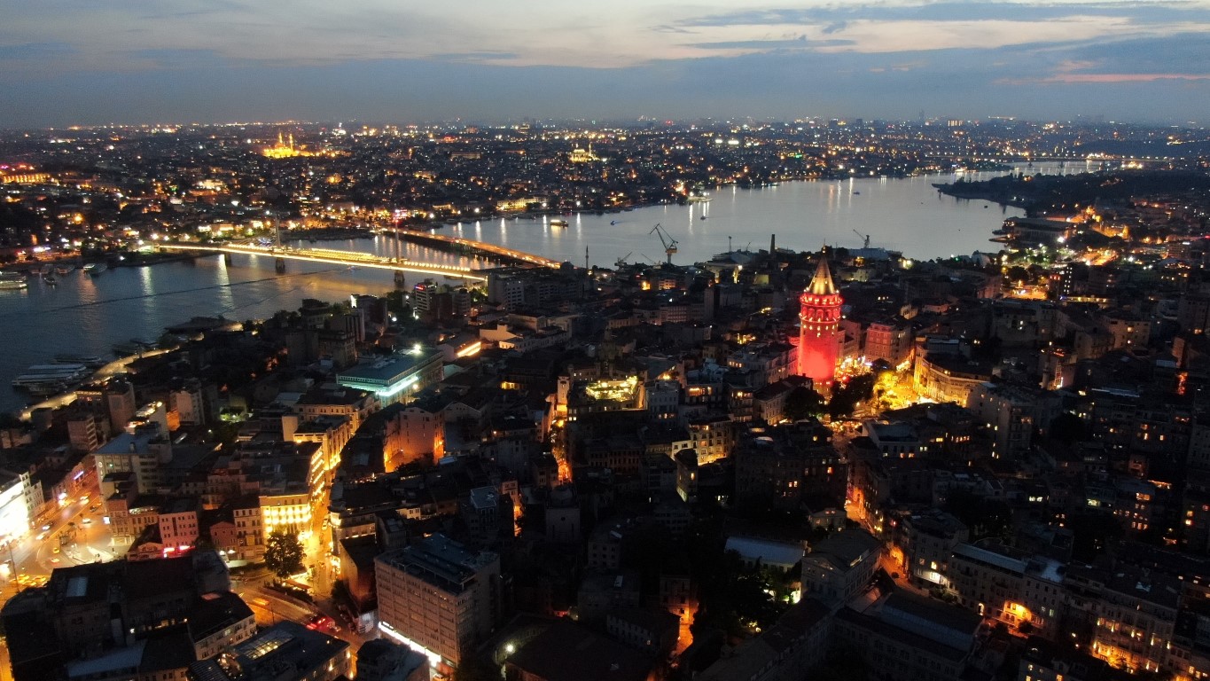 Galata Kulesine Türk Bayrağının yansıtılması drone ile havadan görüntülendi.
