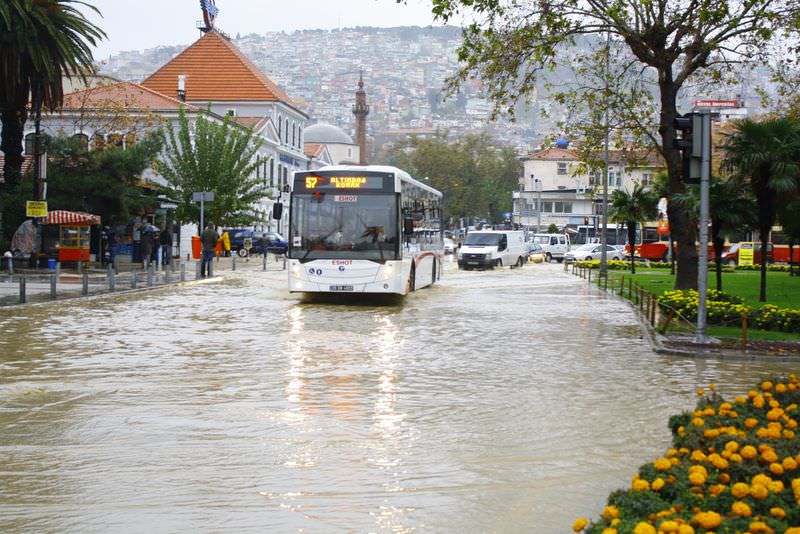 İzmir’de sabah saatlerinde başlayan şiddetli yağmur, günlük hayatı felç etti. Ana cadde, bulvar ve sokakların tamamen su altında kaldığı şehirde insanlar işlerine, okullarına gidemedi. Onlarca araba yolda kalırken birçok meydan ve sokak trafiğe kapatıldı.