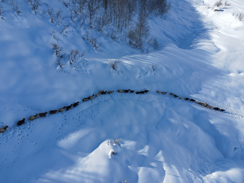 Öğle saatlerinde dağlara çıkan besicilerin ardındaki keçiler de buzlu ve karlı yollardan tek sıra halinde ormana gidiyor. Çobanlar ve keçileri, daha sonra yüksek rakımlı dağlardan inerek 1,5 metreyi geçen kar kalınlığında tehlikeli yolculuğun ardından köye varıyor.