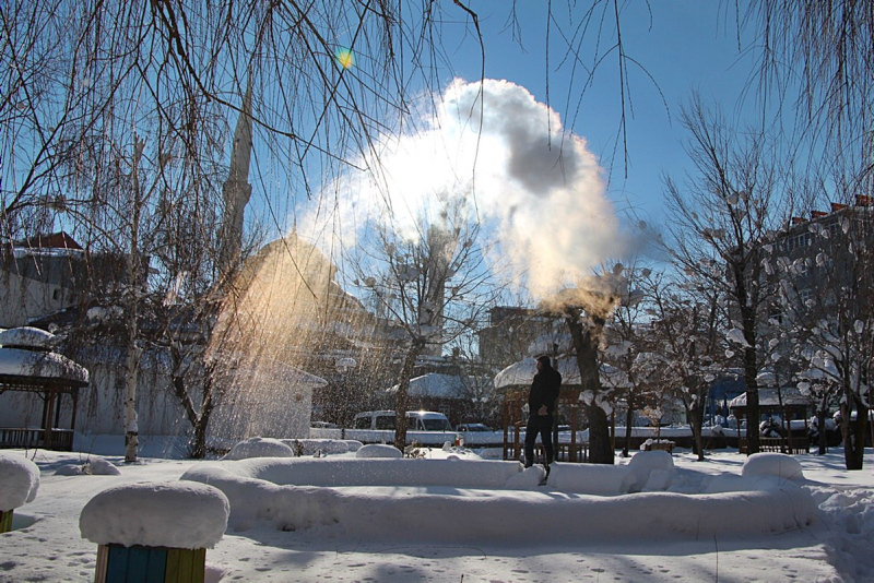 İlçede yaşayan bazı vatandaşlar, evlerinde kaynattıkları suyu havaya attı. Sıcak suyun yere düşmeden donduğu anlar, görsel şölen oluşturdu.