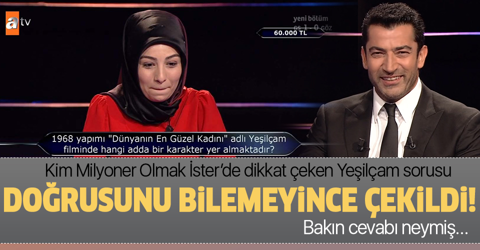 Kim Milyoner Olmak İster'in yayınlanan son bölümünde geceye 60.000 TL değerindeki "1968 yapımı 'Dünyanın En Güzel Kadını' adlı Yeşilçam filminde hangi adda bir karakter yer almaktadır?" sorusu damga vurdu.