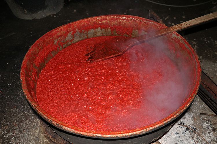 Domatesler pişerken, biberleri farklı bir tencerede yağ ile kavurun. 5 kilo domatese yarım kilo biber eklemeniz yeterli. Biberler kavrulduktan sonra, domatesler ile birleştirin. 🥄