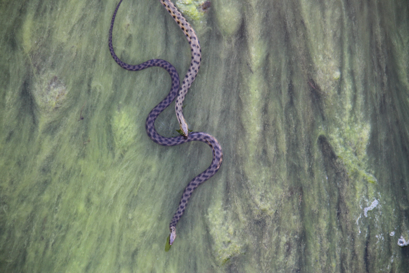 Şelaleye doğru sürekli olarak akıntıya karşı yüzen ve ilerlemeye çalışan çok sayıda su yılanı, demir köprü altında ilginç ve renkli görüntüler sergiliyor.