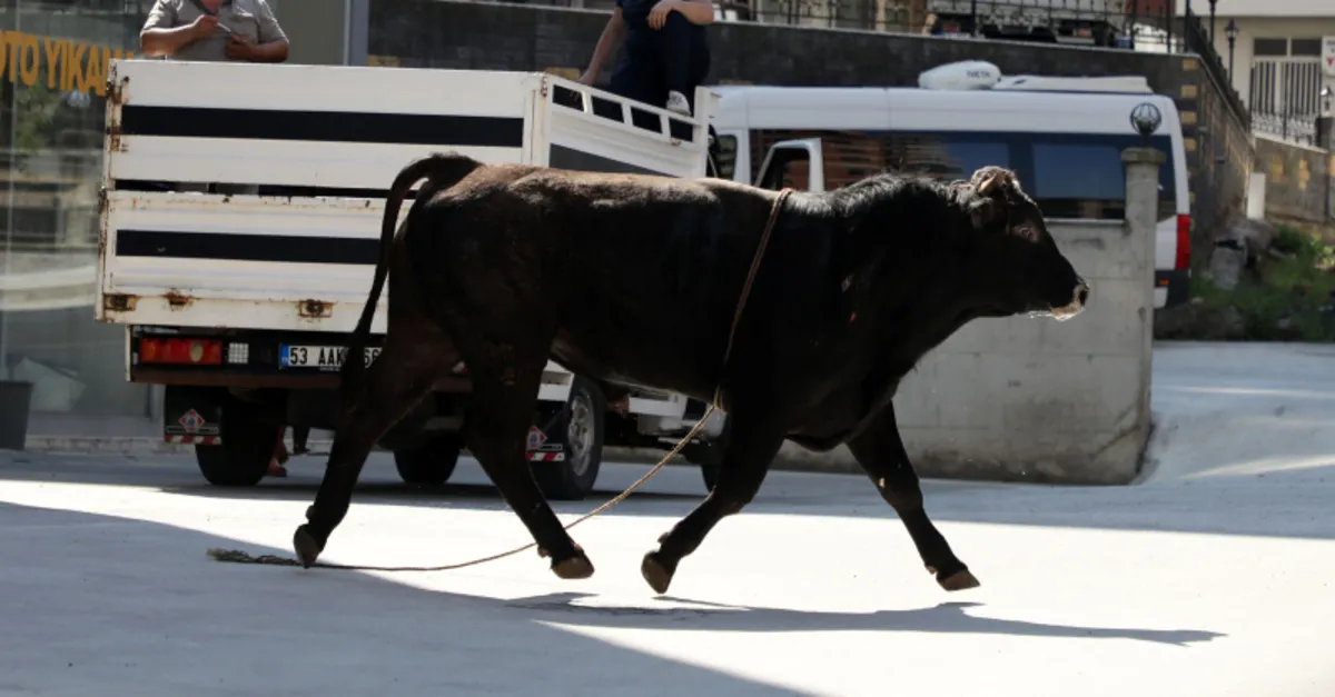 Rize'de, sahibinin elinden kaçan kurbanlık boğa, 1 saatin sonunda Rize Belediyesi Kurban Timi tarafından sakinleştirici iğneyle atılarak yakalandı.
