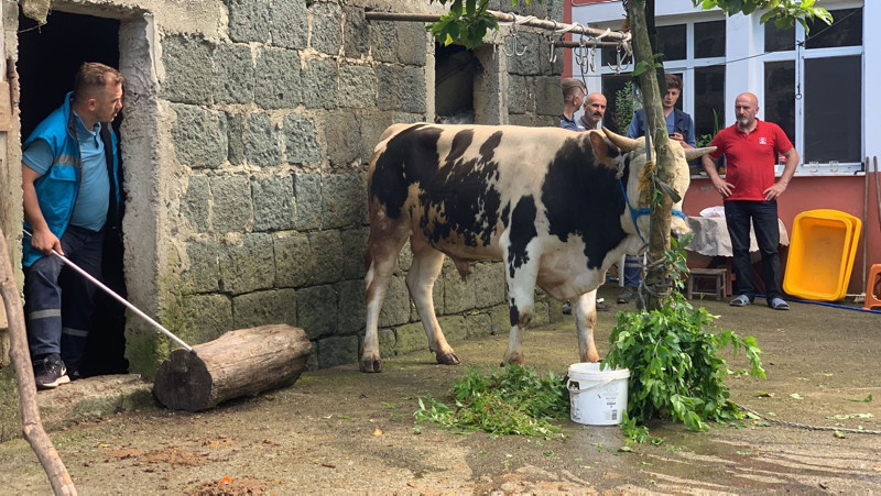 Veliköy köyünde Kadir Kars ve ortaklarına ait kurbanlık boğa, sahipleri tarafından kesim için bahçeye çıkarıldı. Bir anda hırçınlaşan boğa, ağaca bağlı olduğu ipten kurtulmak istedi.