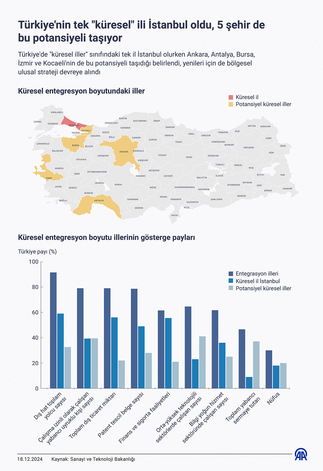 Stratejiye göre, küresel entegrasyon açısından Türkiye'nin tek küresel kenti İstanbul olarak öne çıkıyor. İstanbul, ülkenin batı bölgesinde yer alan en gelişmiş il olarak, dış hat yolcu trafiği, dış ticaret hacmi ve finans sektöründeki önemli payıyla diğer illerden ayrılmakta.